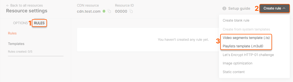 - Select Video segments template (.ts). A new page will open. Click Create rule. Repeat actions for the Playlists template (.m3u8).