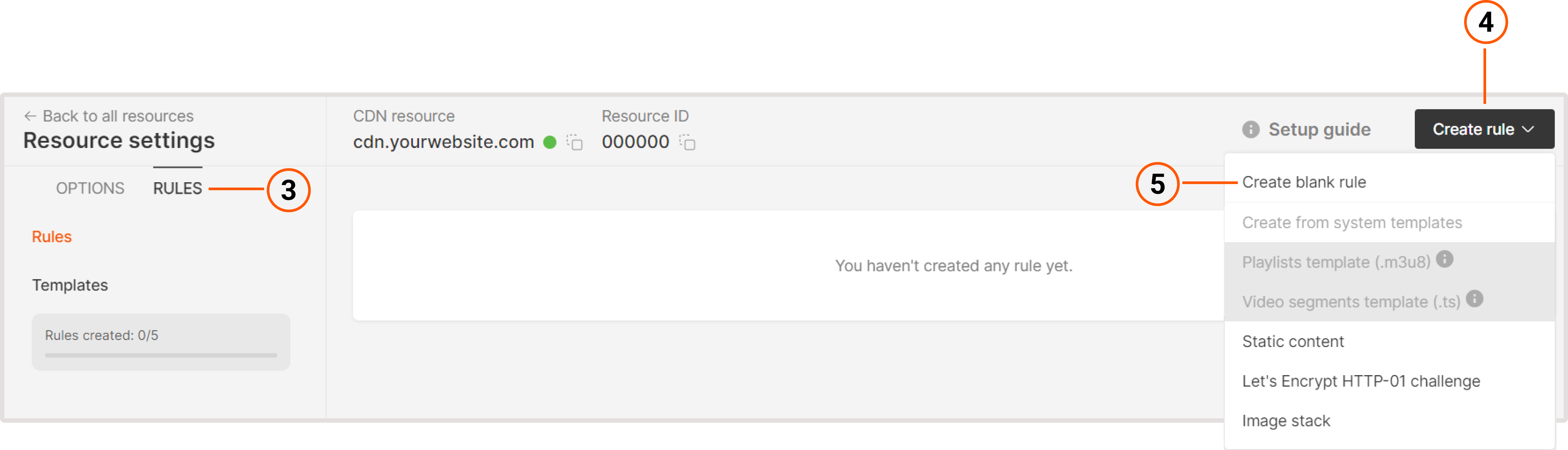 • Via Resource settings : the custom code will be applied to all the CDN resource's content -Via Rules : the custom code will be applied only to certain files