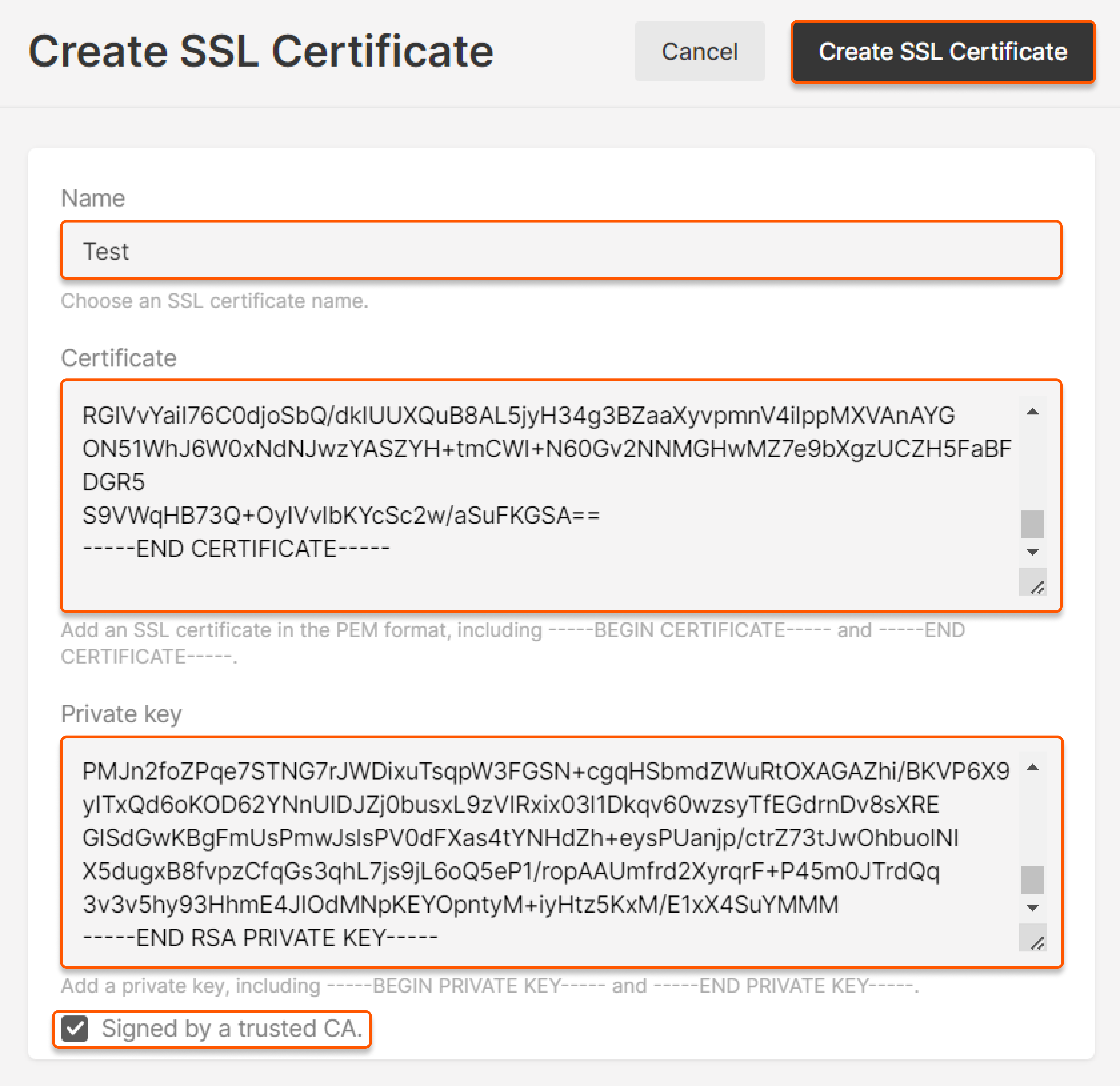 3. All the contents of the certificate must be inserted into the Certificate field, including the tags -----BEGIN CERTIFICATE----- and -----END CERTIFICATE-----.