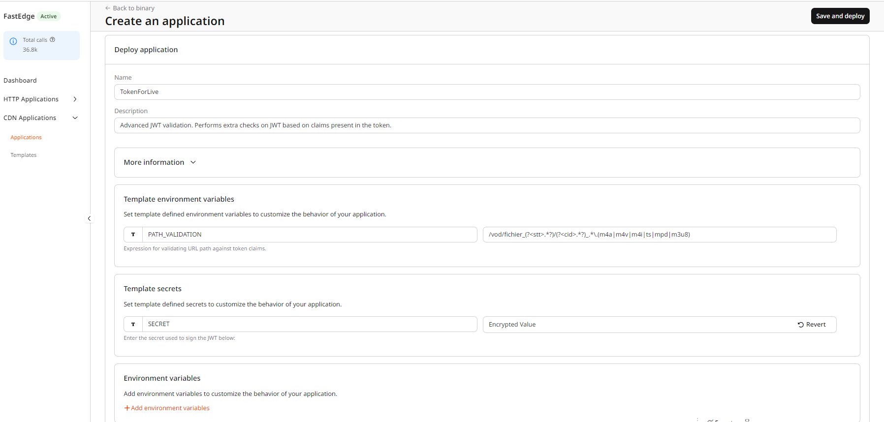 5. Fill in the name, path_validation and the shared key that will be used to sign the token, then click on Save and Deploy.