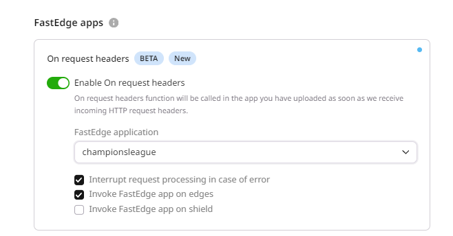In the CDN resource configuration (OPTIONS) select FastEdge apps